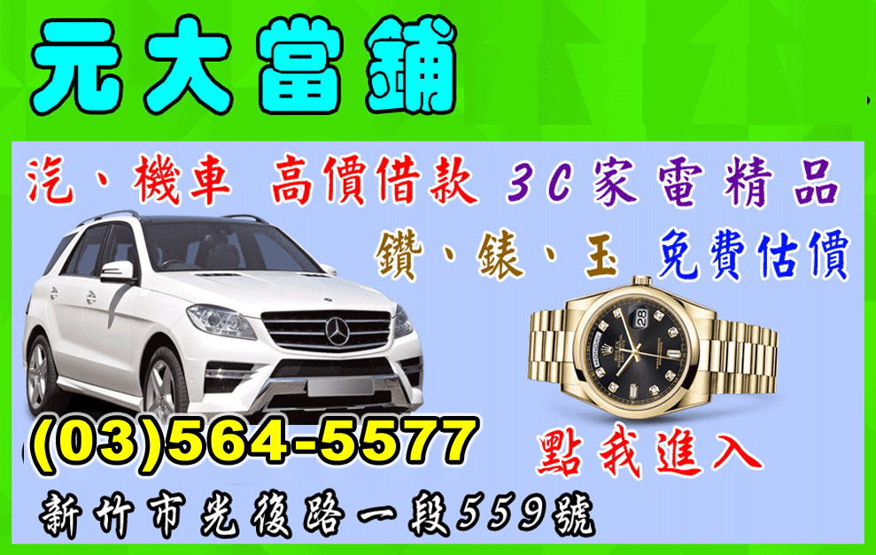 新竹元大當舖提供您最優惠的週轉空間,新竹汽車借款可派專員到府服務,新竹借錢、融資、二胎歡迎多加利用,新竹票貼辦理手續簡便,整合各項借款沒煩惱。